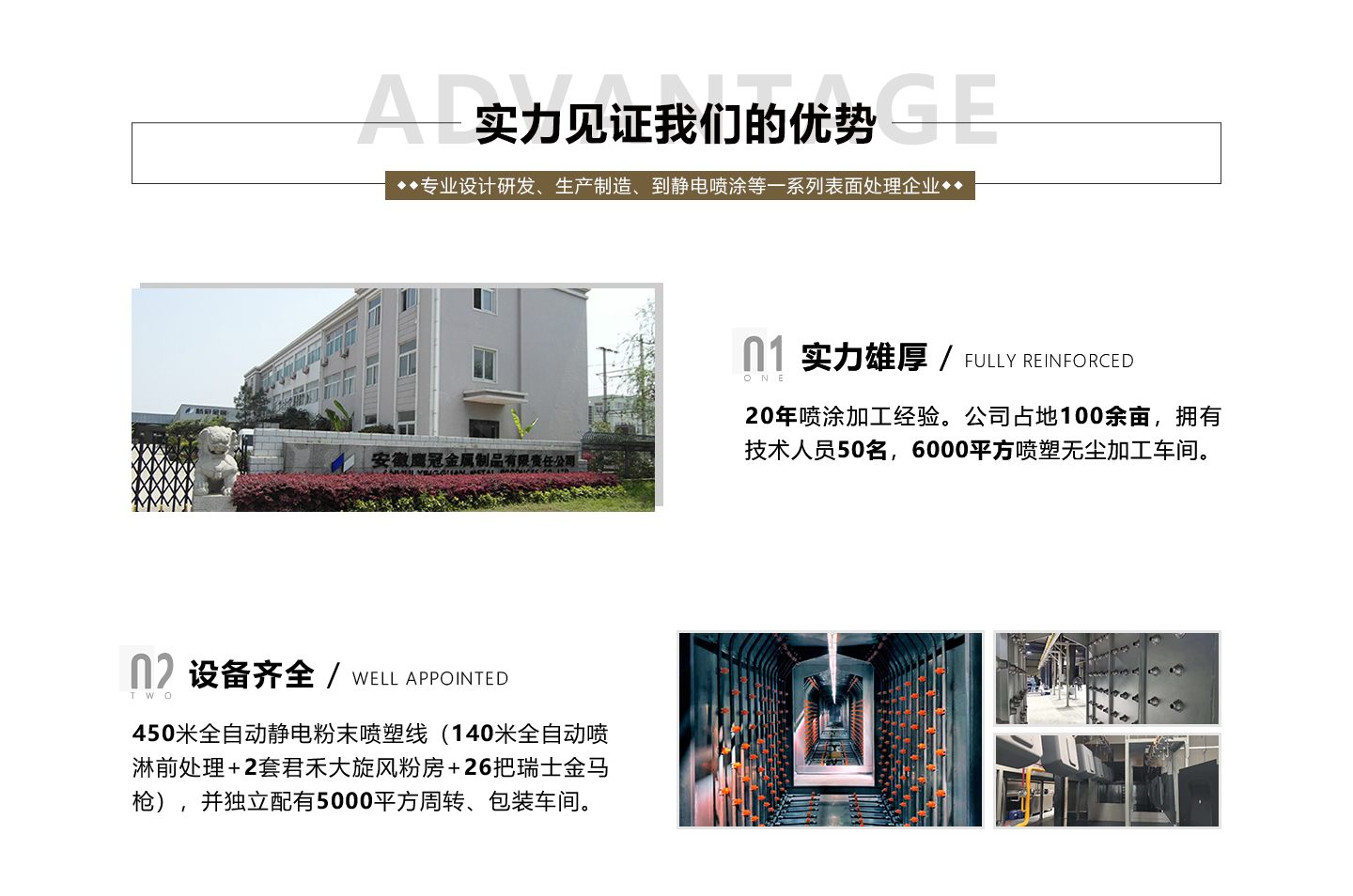 安徽鷹冠金屬制品有限責任公司座落于----安徽合肥新城開發區,占地100畝,總面積20000平方米,是國內規模較大的彩鋼護欄型材研發生產基地之一。公司于一九九八年建廠至今,涉足大型零售商業、房地產行業近20年,已經形成了從設計研發、生產制造、到靜電噴涂等一系列表面處理的專業團隊。公司“新冠”彩鋼系列產品基材采用無縫鍍鋅鋼,雙面高溫熱鍍鋅處理,表面處理使用阿克蘇諾貝爾公司的富鋅環氧涂層,聚酯彩色粉末涂層,經二十多道防腐經典噴涂工藝。產品具有出眾的防銹蝕、耐鹽霧、耐油煙、耐濕熱、耐刮擦的優良特性。現公司擁有150名員工,其中技術人員20名,技工30名。2006年建立新冠彩鋼設計研發檢測中心,由多名...